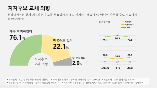수도권과 호남에서는 이 후보가 앞섰다. 삼자 대결에 안 후보가 들어간 경우 충청권은 윤 후보가, 강원·제주는 이 후보가 우세한 것으로 조사됐다.이재명·윤석열·안철수 후보 간 삼자대결의 경우 △서울에서는 윤석열 31.0%, 이재명 39.3%, 안철수 17.7% △경기·인천 윤석열 37.6%, 이재명 39.8%, 안철수 12.2% △대전·세종·충청 윤석열 40.0%, 이재명 37.9%, 안철수 11.0% △광주·전라 윤석열 10.4%, 이재명 64.5%, 안철수 10.4% △대구·경북 윤석열 54.5%, 이재명 25.2%, 안철수 11.9% △부산·울산·경남 윤석열 49.3%, 이재명 26.6%, 안철수 13.3% △강원·제주 윤석열 39.8%, 이재명 42.1%, 안철수 8.6% 등이었다.여야 후보와 심상정 후보와의 삼자대결에서는 충청권, 강원·제주가 반대의 흐름을 보였다.구체적으로 △서울에서는 윤석열 35.8%, 이재명 39.7%, 심상정 4.6% △경기·인천 윤석열 40.3%, 이재명 40.6%, 심상정 3.2% △대전·세종·충청 윤석열 39.7%, 이재명 40.4%, 심상정 4.2% △광주·전라 윤석열 11.4%, 이재명 66.8%, 심상정 3.1% △대구·경북 윤석열 52.8%, 이재명 27.9%, 심상정 1.3% △부산·울산·경남 윤석열 51.0%, 이재명 29.4%, 심상정 4.4% △강원·제주 윤석열 42.5%, 이재명 39.8%, 심상정 0.0% 등으로 조사됐다.지지 후보 교체 의향과 관련, '현재 지지하는 후보를 계속 지지하겠다'고 답한 비율은 76.1%였다. '지지 후보를 바꿀 수도 있다'는 22.1%였다. '잘 모르겠다'는 2.9%였다.이번 조사는 유무선 자동응답 전화조사 방식으로 진행됐다. 휴대전화 RDD 90%, 유선전화 RDD 10% 비율로 피조사자를 선정했다. 최종 응답률은 6.1%, 표본오차는 95% 신뢰수준에서 ±3.1%p다. 자세한 조사 개요와 결과는 중앙선거여론조사심의위원회 홈페이지를 참고하면 된다.