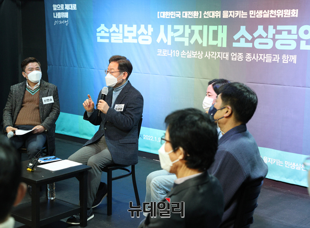 이재명 더불어민주당 대선 후보가 9일 오후 서울 종로구 우리소극장에서 코로나19 손실보상 사각지대 업종 종사자들과 함께 연 '손실보상 사각지대 소상공인 간담회'에서 발언을 하고 있다. (사진=이재명 캠프)