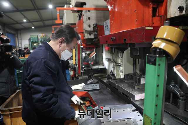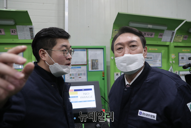 윤석열 국민의힘 대선 후보가 10일 오전 인천 남동구 경우정밀에서 중소기업 경영 및 근로환경 개선 방안을 모색하기 위해 현장 방문해 박진수 경우정밀 대표이사의 제품 설명을 듣고 있다. (사진=윤석열 캠프)