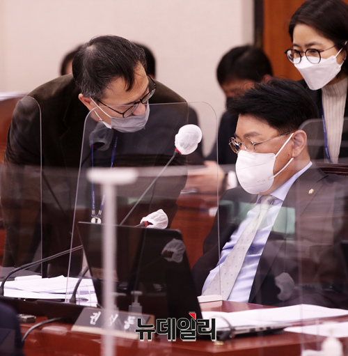 박주민 더불어민주당 간사와 장제원 국민의힘 간사가 10일 오후 국회에서 열린 법제사법위원회 전체회의에서 대화를 나누고 있다. (사진=공동취재단)
