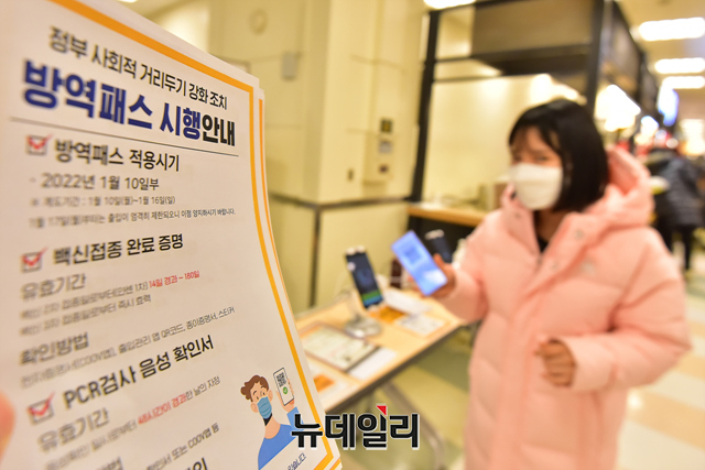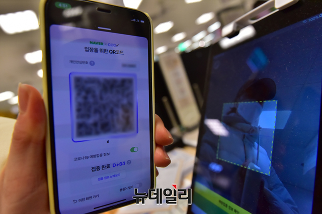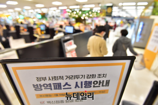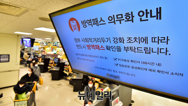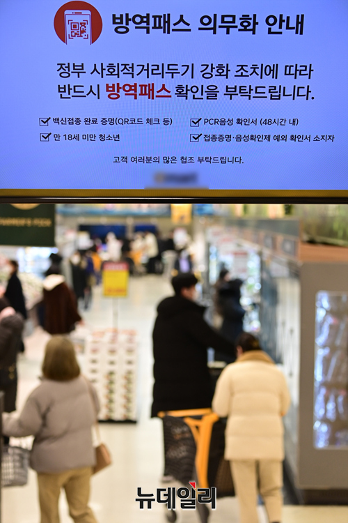 백화점과 대형마트 등 업계에 코로나19 방역패스 의무화(접종증명·음성확인제)가 첫 시행된 10일 오후 서울 용산구의 한 대형마트를 찾은 고객들이 전자출입명부(QR코드)를 인증하고 있다.'접종증명·음성확인제 의무화'는 연면적 3,000㎡ 이상 백화점, 쇼핑몰, 대형마트 등 대규모 점포에 해당된다. 코로나19 백신접종증명서나 48시간 내 발급받은 유전자증폭(PCR) 검사 음성확인서가 없으면 만 19세 이상 성인은 혼자라도 대규모 점포를 이용할 수 없다. 반면에 소규모 점포나 편의점은 적용 대상이 아니다.