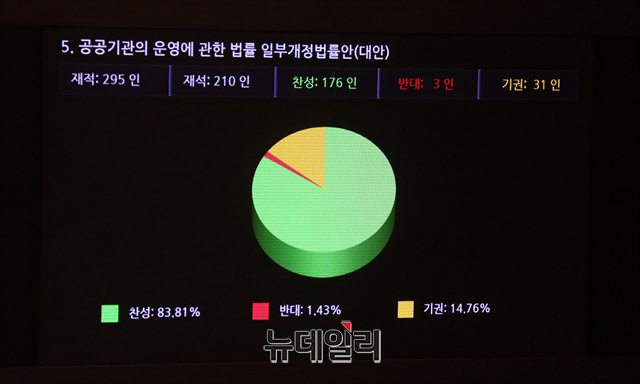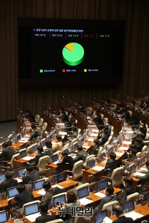 '공공기관 노동이사제' 도입을 골자로하는 공공기관의 운영에 관한 법률 일부개정법률안이 11일 오후 국회에서 열린 본회의에서 가결되고 있다. (사진=공동취재단)