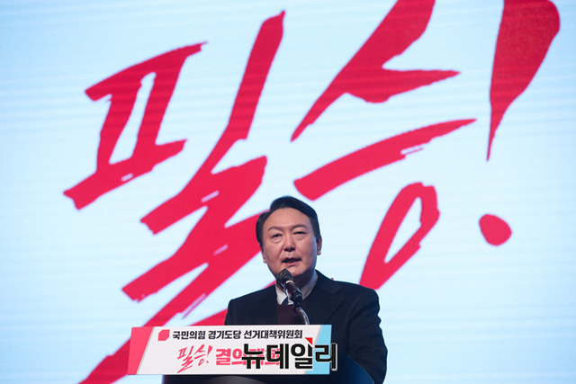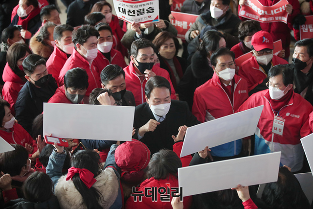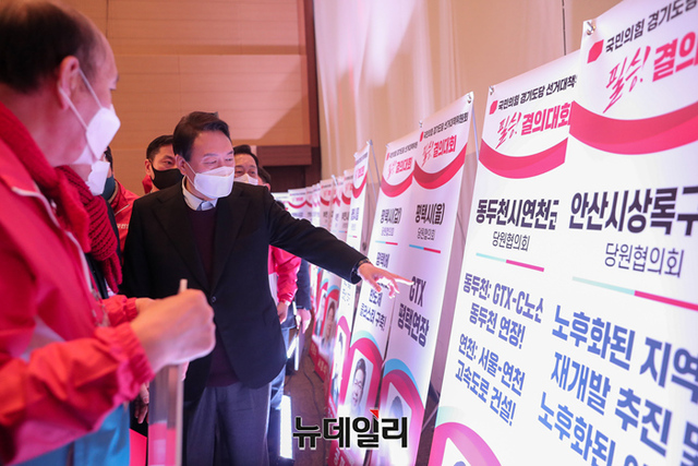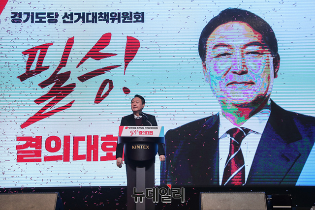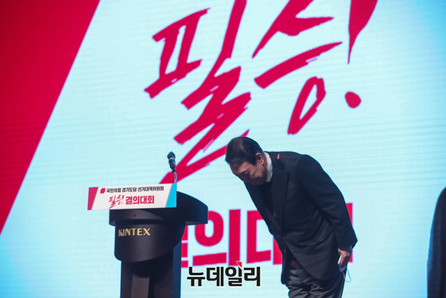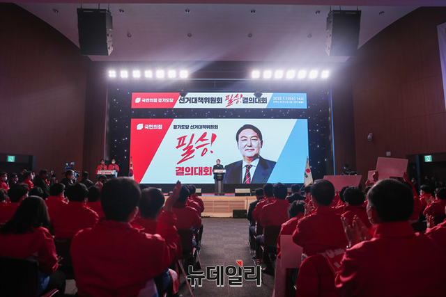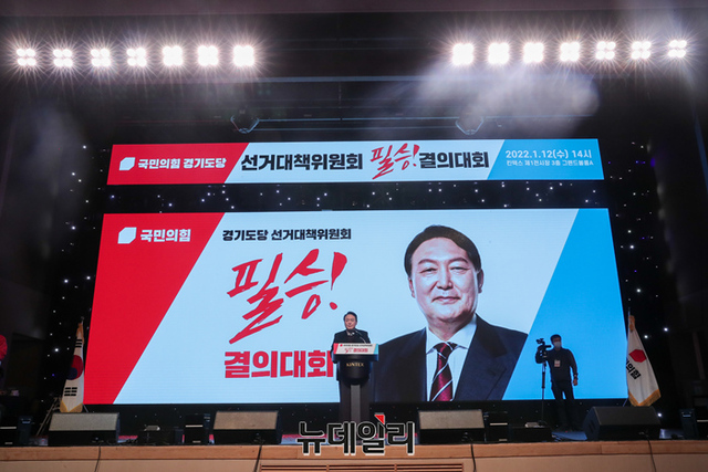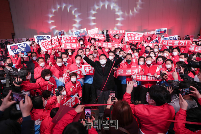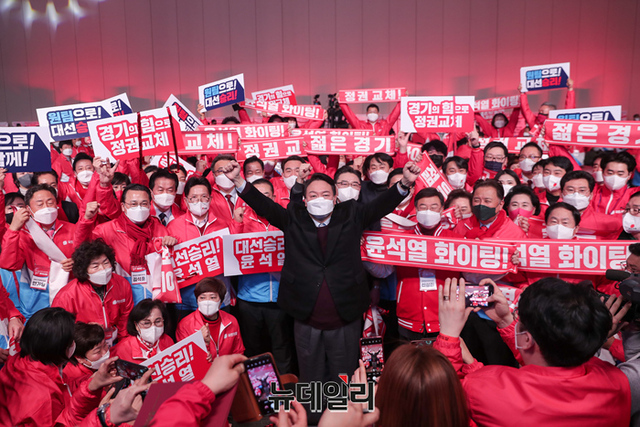 윤석열 국민의힘 대선후보가 12일 오후 경기 고양시 일산 킨텍스에서 열린 경기도 선거대책위원회 출범식에 참석해 두손을 들고 화답하고 있다. (사진=윤석열 캠프)