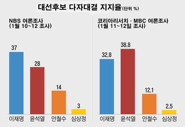 13일 발표 코리아리서치 포함된 NBS에선 李 37% vs 尹 28%같은 날 발표, 코리아리서치·MBC 조사에선 尹 38.8% vs 李 32.8%전문가 "北 미사일, 이상철 씨 사망이 尹에는 호재, 李에는 악재 돼"