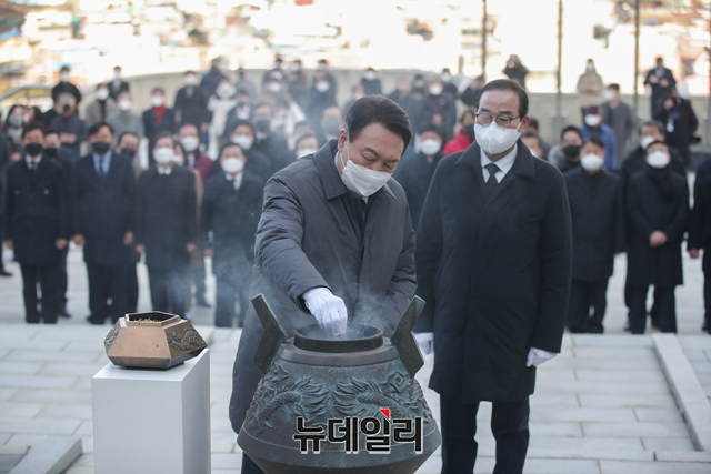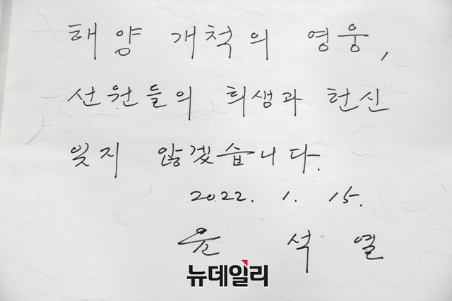 윤 후보는 순진석원위령탑에서 '해양 개척의 영웅, 선원들의 희생과 헌신 잊지 않겠습니다'라고 방명록을 남겼다. (사진=윤석열 캠프)