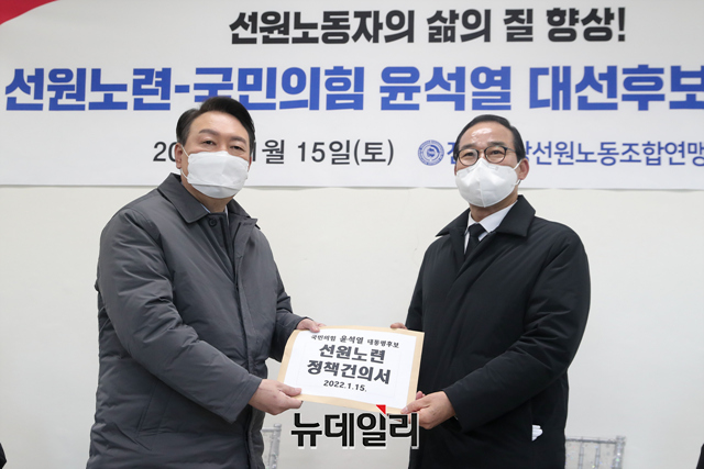 부산지역을 방문 중인 윤석열 국민의힘 대선후보가 15일 오전 부산 영도구 순직선원위령탑을 방문해 참배를 마친 직후 해상선원노조 간담회에서 인사말을 하고 있다.