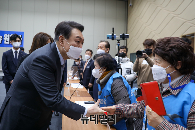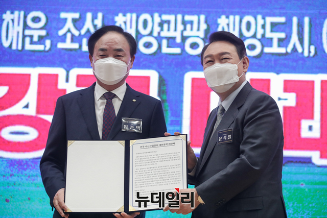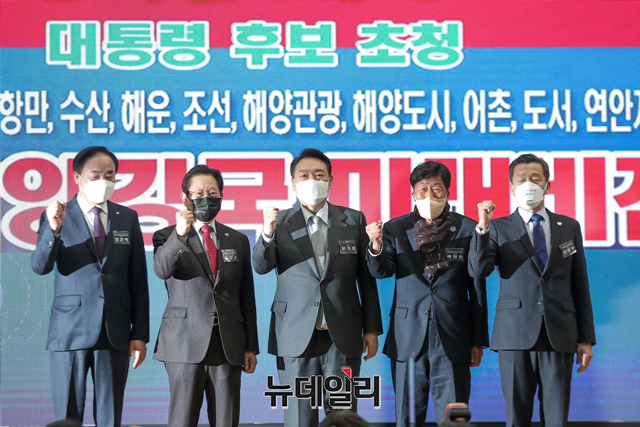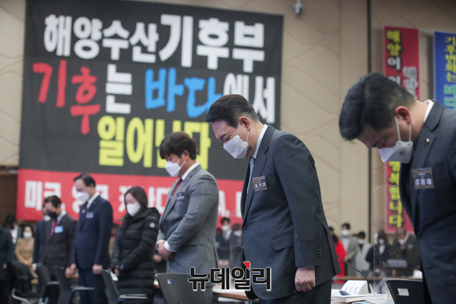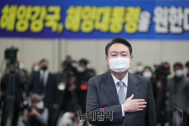 윤석열 국민의힘 대선후보가 15일 오전 부산 동구 부산항여객터미널 컨벤션센터에서 진행된 신해양강국 비전선포식에서 국민의례를 하고 있다. (사진=윤석열 캠프)