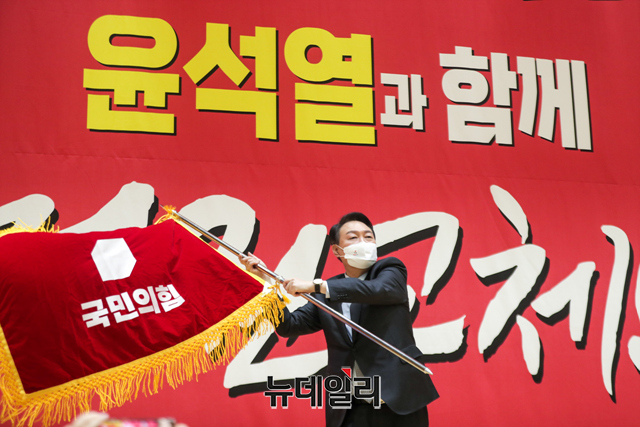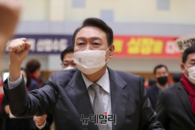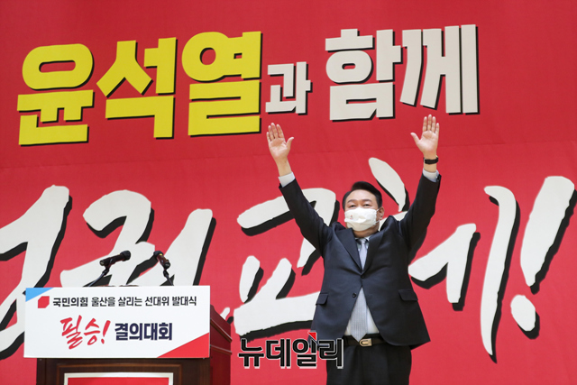 윤석열 국민의힘 대선후보가 15일 오후 울산 동구 전하체육센터에서 진행된 울산시 선거대책위원회 필승결의대회에서 발언하고 있다. (사진=윤석열 캠프)
