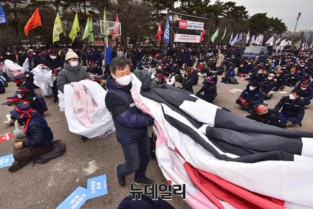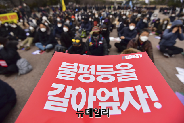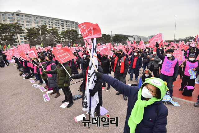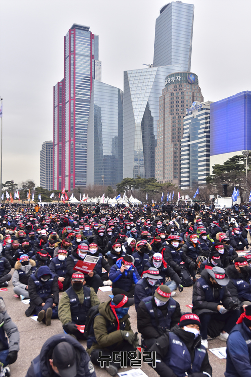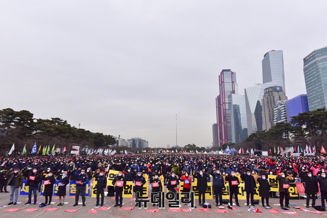 민노총과 한국진보연대, 전국농민회총연맹, 빈민해방실천연대 등으로 구성된 전국민중행동이 15일 오후 서울 여의도공원에서 '2022 민중총궐기 대회(민중총궐기)'를 갖고 있다. 주최측은 1만 5천여 명이 참가했다고 밝혔다.민중총궐기는 △식량주권 실현 △근로기준법 적면 적용과 노동기본권 확대 △주택·의료·교육·돌봄 공공성 강화를 통한 평등사회로의 체제 전환 △차별금지법 제정 및 국가보안법 폐지 △한미연합 군사연습 영구 중단 등을 요구했다.이번 민중총궐기는 박근혜 정부 퇴진을 촉구하고 나선 2016년 이후 약 5년 만에 개최됐다. 지난해에도 서울시와 경찰이 집회를 불허하자 7·3 노동자대회(서울 종로), 10·20 총파업 투쟁(서울 서대문), 11·13 전국노동자대회(서울 동대문) 등 도심 곳곳에서 기습 집회를 단행한 바 있다.