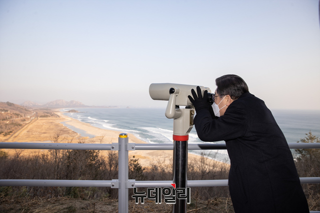 이재명 더불어민주당 대선후보가 16일 오전 강원 고성군 통일전망대를 방문하고 있다.