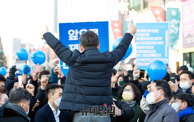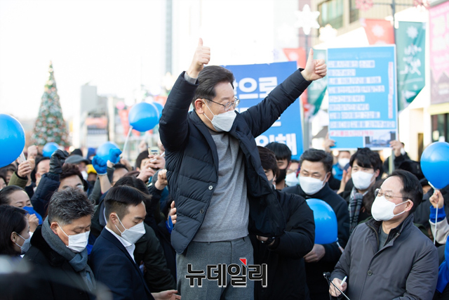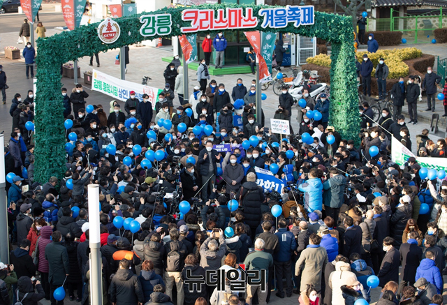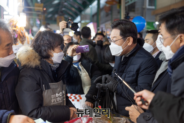 이재명 더불어민주당 대선후보가 16일 오후 강원 강릉시 중앙시장을 방문해 시민들과 인사를 나누고 있다. (사진=이재명 캠프)
