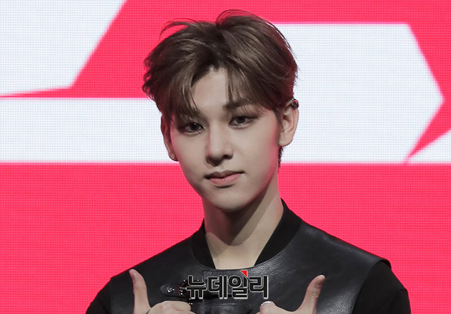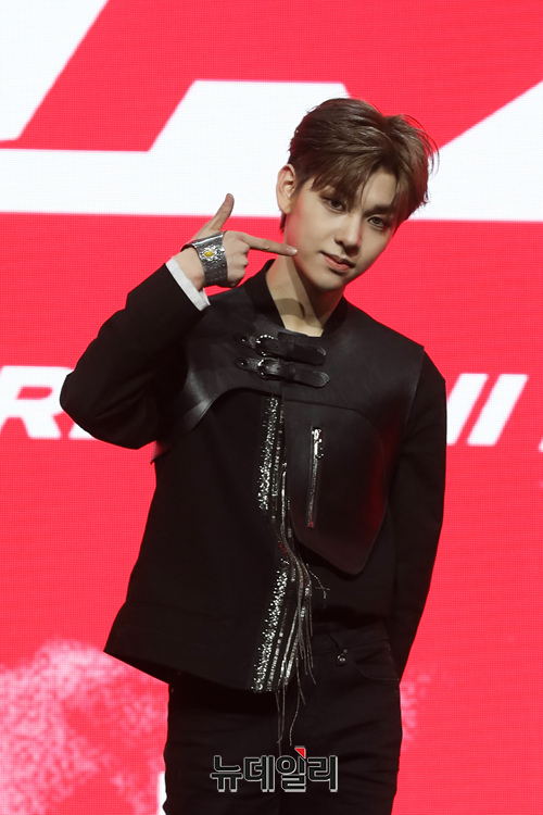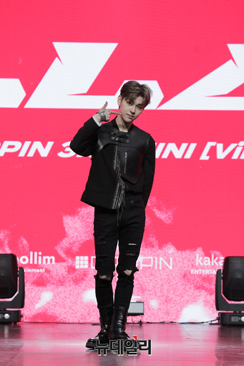 그룹 드리핀 멤버 김동윤이 17일 오후 온라인 생중계로 진행된 세 번째 미니앨범 '빌런 (Villain)' 발매기념 쇼케이스에 포토타임을 갖고 있다.