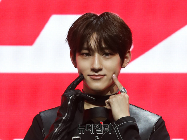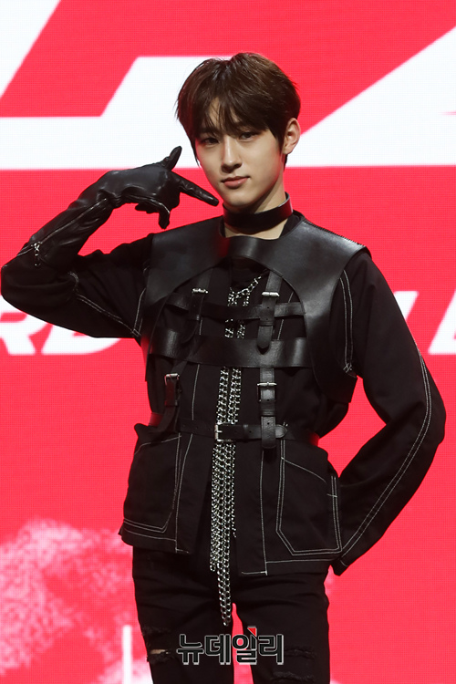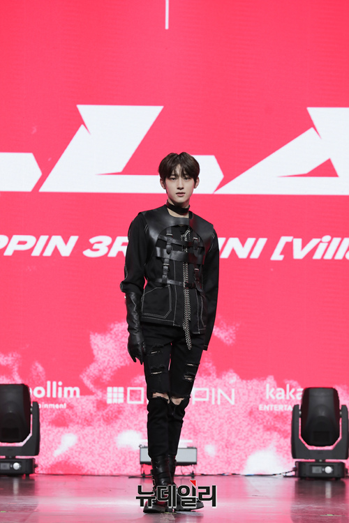 그룹 드리핀 멤버 김민서가 17일 오후 온라인 생중계로 진행된 세 번째 미니앨범 '빌런 (Villain)' 발매기념 쇼케이스에 포토타임을 갖고 있다.