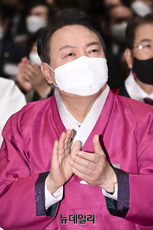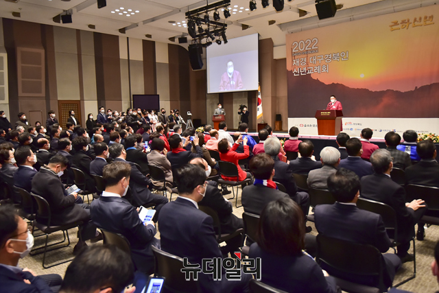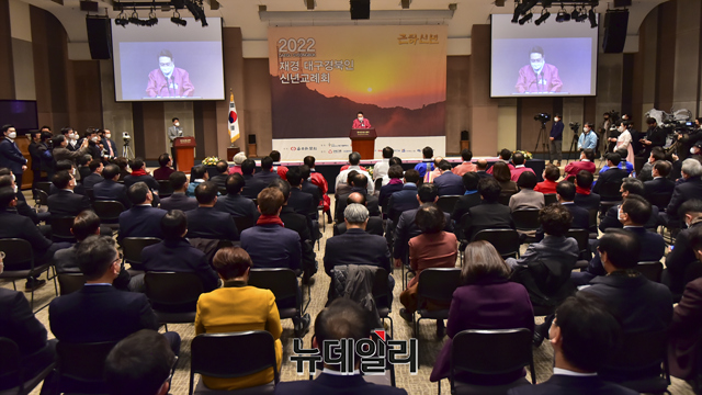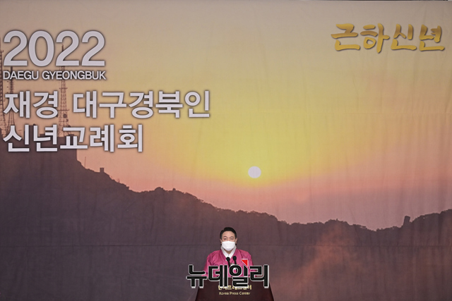 윤석열 국민의힘 대선후보가 17일 오후 서울 중구 프레스센터에서 진행된 2022 재경 대구경북인 신년교례회에서 신년사를 하고 있다.