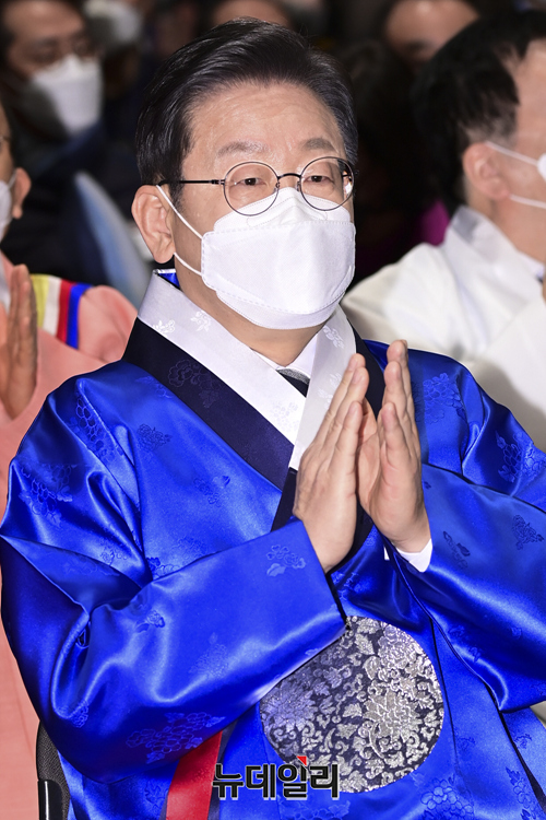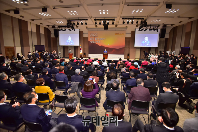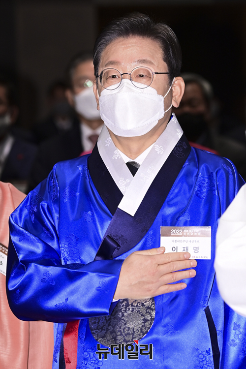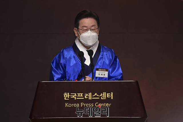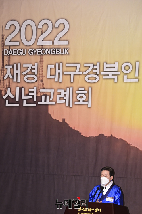 이재명 더불어민주당 대선후보가 17일 오후 서울 중구 프레스센터에서 진행된 2022 재경 대구경북인 신년교례회에서 신년사를 하고 있다.
