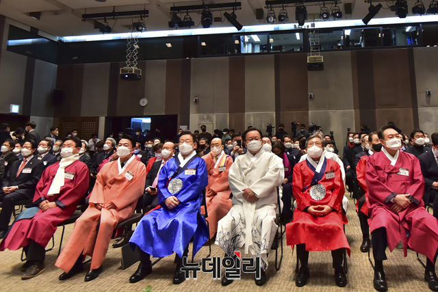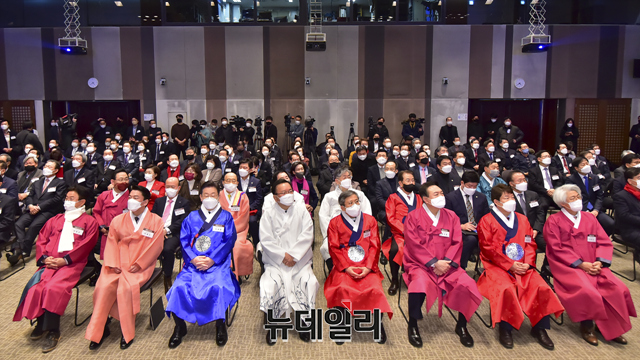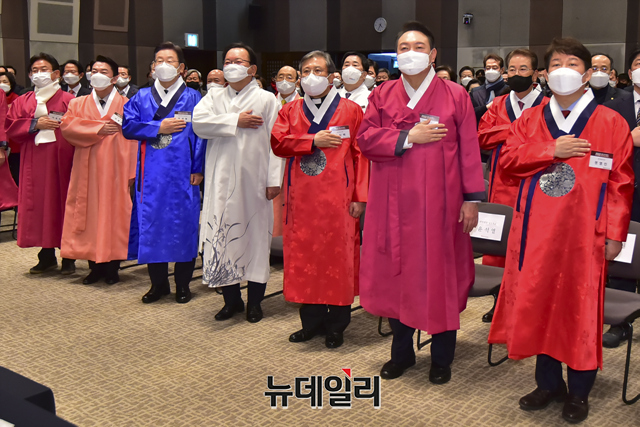 이재명 더불어민주당 대선후보, 김부겸 국무총리, 윤석열 국민의힘 대선후보, 안철수 국민의당 대선후보를 비롯한 내빈들이 17일 오후 서울 중구 프레스센터에서 진행된 2022 재경 대구경북인 신년교례회에서 구호를 외치고 있다.