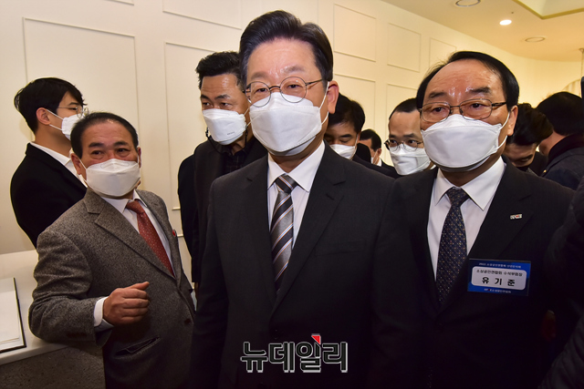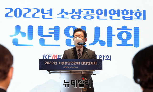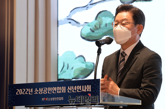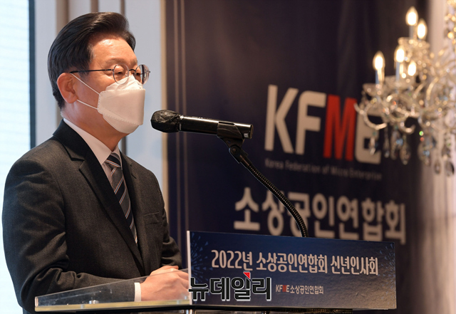 이재명 더불어민주당 대선 후보가 18일 오후 서울 여의도 CCMM빌딩에서 열린 2022년 소상공인연합회 신년인사회에서 인사말을 하고 있다.