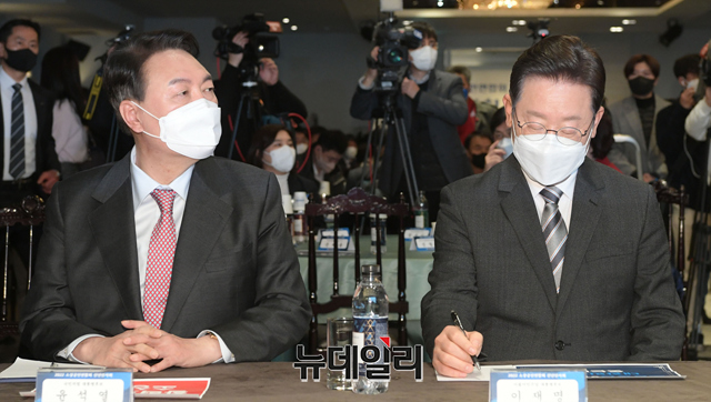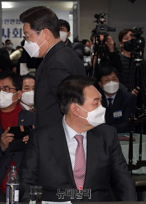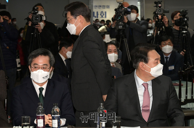 이재명 더불어민주당 대선후보, 윤석열 국민의힘 대선후보, 김동연 새로운물결 대선후보가 18일 오후 서울 여의도 CCMM빌딩에서 열린 2022년 소상공인연합회 신년인사회에 참석해 있다.