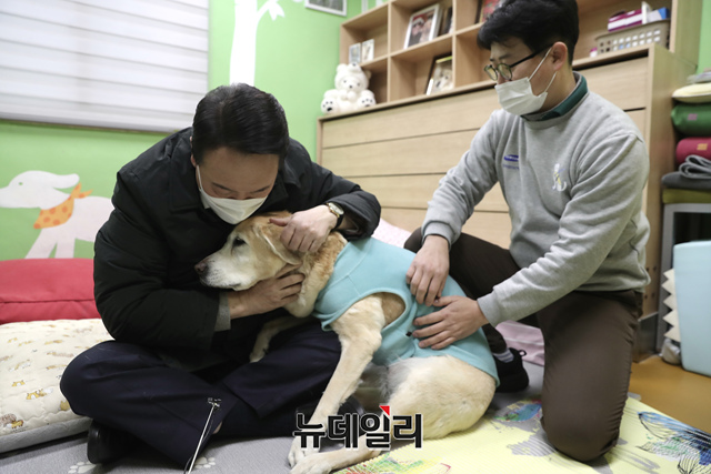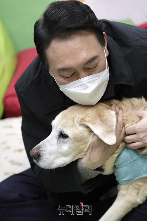 윤석열 국민의힘 대선후보가 19일 오후 경기도 용인시 처인구 삼성화재 안내견학교를 방문해 장애인 관련 정책공약 발표에 앞서 안내견을 포옹하고 있다. (사진=윤석열 캠프)