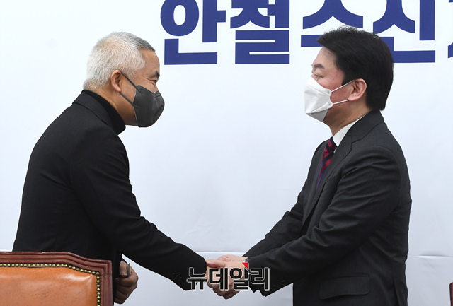 안철수 국민의당 대선후보가 20일 오전 국회에서 열린 제13차 중앙선거대책위원회의에 앞서 상임선대위원장으로 영입된 최진석 명예교수 입당식을 하고 있다. (사진=공동취재단)