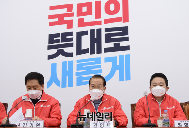 권영세 국민의힘 선거대책본부장이 20일 오전 국회에서 열린 선거대책본부-원내지도부 연석회의에 참석해 발언을 하고 있다. (사진=공동취재단)