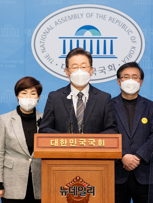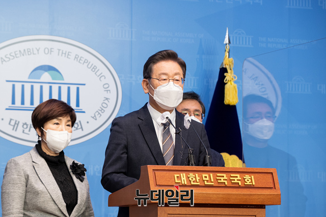 이재명 더불어민주당 대선후보가 21일 오전 국회 소통관에서 긴급기자회견을 갖고 소상공인·자영업자 지원 목적의 추가경정예산 편성 논의를 위한 여야 모든 대선 후보 간 긴급 회동을 제안하고 있다. (사진=이재명 캠프)