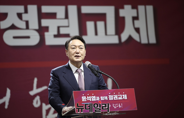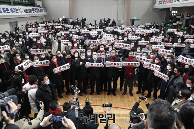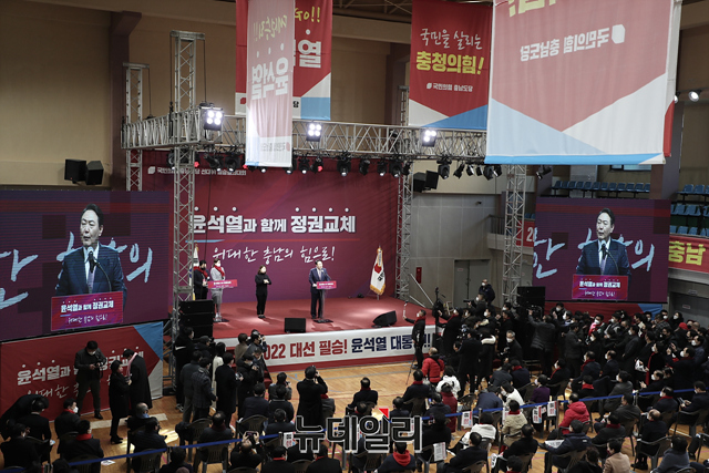 윤석열 국민의힘 대선후보가 21일 오전 충남 천안시 아우내실내체육관에서 진행된 충남도당 선대위 필승결의대회에서 구호를 외치고 있다. (사진=윤석열 캠프)