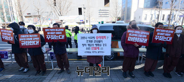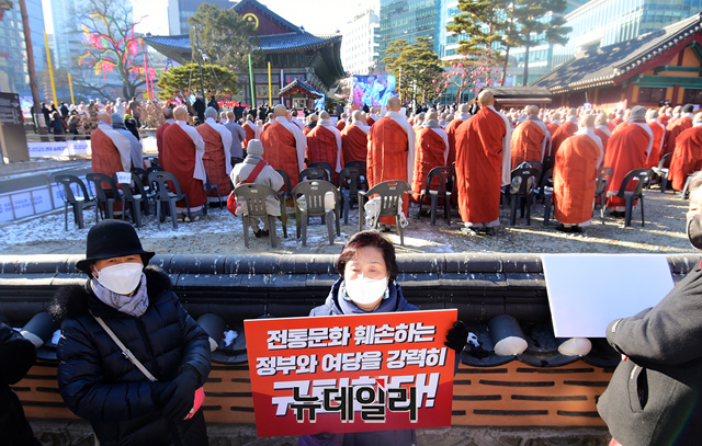 '종교편향 불교왜곡 근절과 한국불교 자주권 수호를 위한 전국승려대회'가 21일 오후 서울 종로구 조계사에서 열린 가운데 신자들이 정부와 공직자들의 종교편향을 규탄하는 피켓을 들고 있다.조계종은 "현 정부 들어 심화한 공공영역에서의 종교편향 행위들이 스님과 불자들이 더는 묵과할 수 없을 정도로 심각한 상태에 이르렀다"며 승려대회 개최 이유를 밝혔다.현 정부에서 벌어진 종교편향·불교왜곡 사례로 ▲정청래 더불어민주당 의원의 문화재관람료 비하 발언 ▲정부의 천주교 캐럴캠페인 지원 ▲천진암 등 불교유적의 천주교 성지화 ▲국·공립합창단의 기독교 찬송공연 등을 들었다.이날 승려대회에는 정청래 의원과 송영길 민주당 대표 등이 참석해 재차 사과의 뜻을 밝혔지만 스님들의 반발로 무산 됐다.