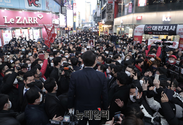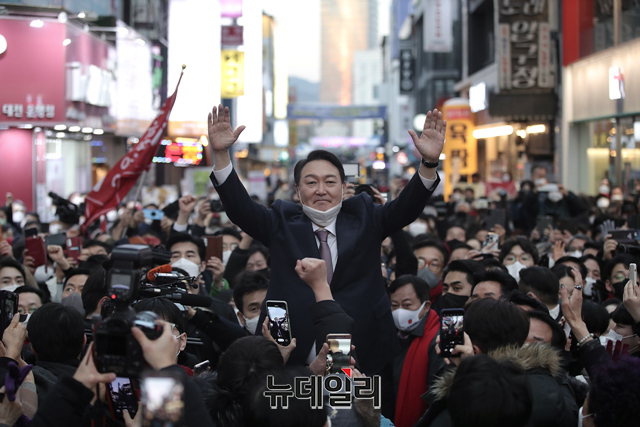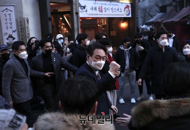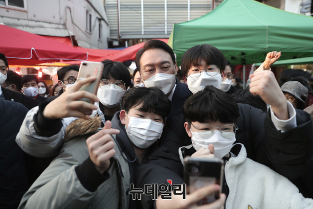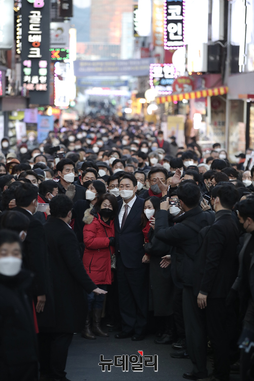 윤석열 국민의힘 대선후보가 21일 오후 대전 동구 중앙시장을 방문해 시민들에게 인사를 나누고 있다. (사진=윤석열 캠프)
