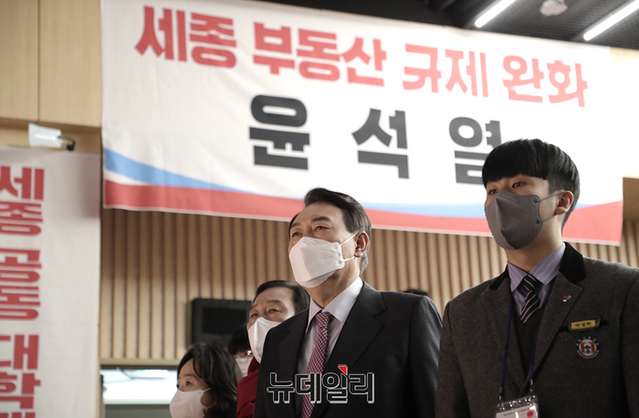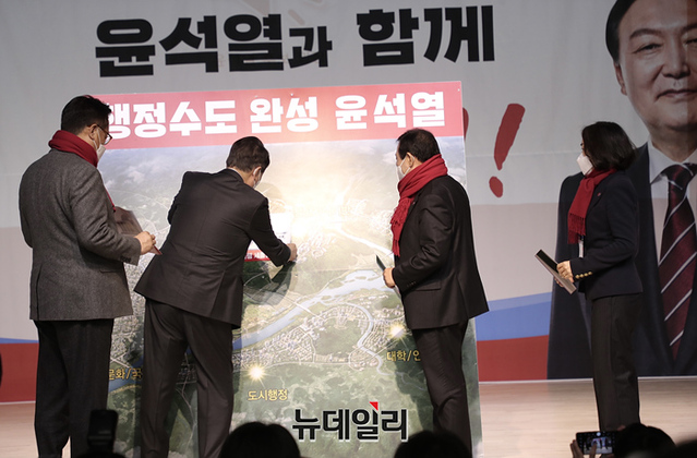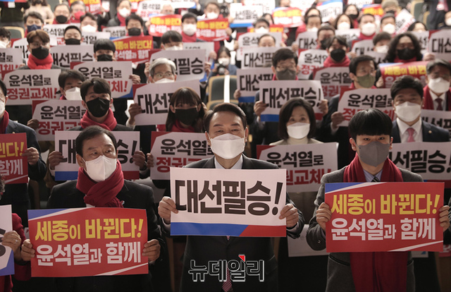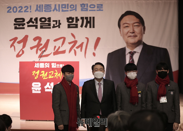 충청지역을 방문중인 윤석열 국민의힘 대선후보가 22일 오전 세종시 비오케이아트센터에서 열린 세종 선대위 필승결의대회 참석해 발언하고 있다. (사진=윤석열 캠프)