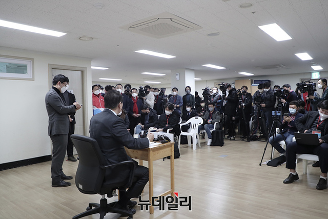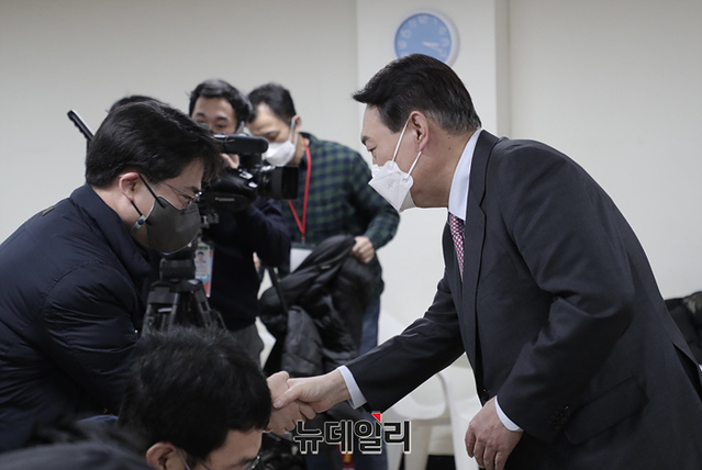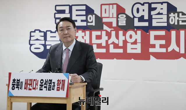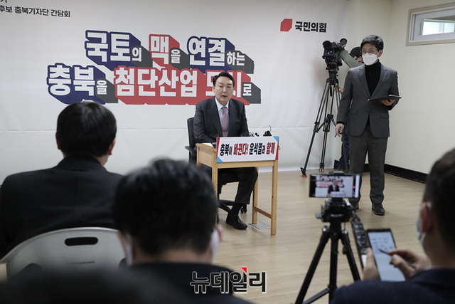충청지역을 방문중인 윤석열 국민의힘 대선후보가 22일 오후 충북 청주시 청주시장애인스포츠센터에서 열린 충북 지역 기자단 간담회에 참석해 발언하고 있다. (사진=윤석열 캠프)