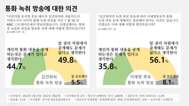 '이재명 통화 녹취 방송해야 하냐'고 묻자… "문제 있다" 응답은 35.8%에 그쳐이명수, 김건희 통화 녹취… "정치적 의도" 55.4% vs "정당한 취재" 34.8%