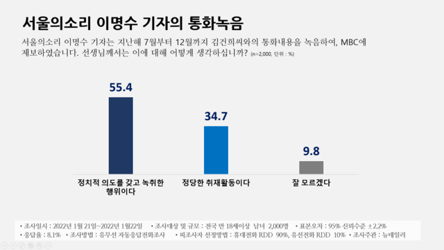 이명수, 김건희 통화 녹취… "정치적 의도" 55.4%한편 이명수 기자가 지난해 7월부터 12월까지 김건희씨와 통화녹음을 녹음해 MBC에 제보한 것과 관련 "정치적 의도를 갖고 녹취한 행위"라고 응답한 비율은 55.4였다. 34.8%는 "정당한 취재활동", 9.8%는 "잘 모르겠다"고 답했다.이번 조사는 유·무선 자동응답 전화조사 방식으로 진행됐다. 휴대전화 RDD 90%, 유선전화 RDD 10% 비율로 피조사자를 선정했으며, 최종 응답률은 8.1%다. 표본오차는 95% 신뢰수준에서 ±2.2%p다. 자세한 조사 개요와 결과는 중앙선거여론조사심의위원회 홈페이지를 참고하면 된다.