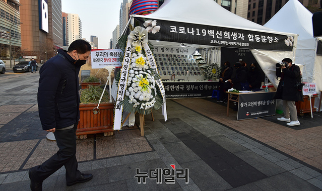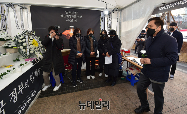 김기현 국민의힘 원내대표가 23일 오후 서울 중구 청계광장에 마련된 코로나19 백신 피해 희생자 합동분향소를 방문해 조문하고 있다. 김 대표는 조문 직후 유가족들을 만나 요구사항을 들었다.합동분향소는 12일부터 코로나19백신피해자가족협의회(코백회)가 운영중이다. 매주 토요일 오후에는 집회가 진행된다.코백회는 △정부의 진정한 사과 △이상반응 전담 콜센터와 부작용치료 지정병원 선정 △의사에게 백신 이상반응 신고 자율권 부여 △피해보상 심의위원회 심의에 피해자 가족 입회 △백신 안정성 재검토와 심의내용 공개 △질병관리청 심의 기준 결과 전면 무효화 △부검하지 못한 사례도 심의 △한국형 인과성 마련 △만 12~17세 소아 청소년의 의무접종과 백신패스 철회 △피해자 특별접 제정 △서울광장에 분향소 설치 △질병청에 피해자를 위한 위령탑 설립 등을 정부에 요구했다.