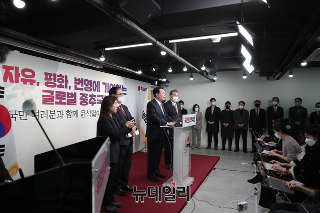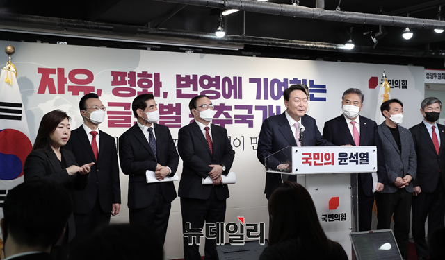 윤석열 국민의힘 대선후보가 24일 서울 여의도 중앙당사에서 '자유·평화·번영에 기여하는 글로벌 중추국가' 외교안보 글로벌 비전 발표를 하고 있다. (사진=윤석열 캠프)