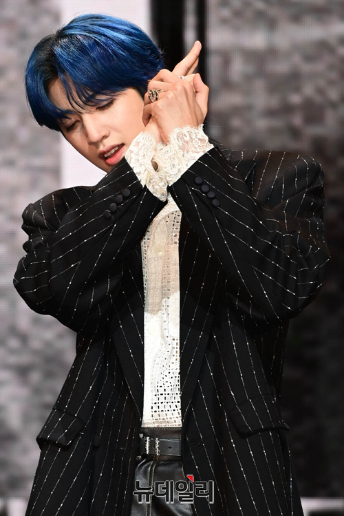 아이돌그룹 펜타곤 멤버 우석이 24일 오후 서울 광진구 예스24 라이브홀에서 열린 열두 번째 미니앨범 '인바잇유(IN:VITE U)' 발매 기념 쇼케이스에서 포즈를 취하고 있다.