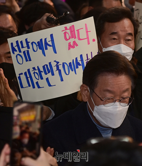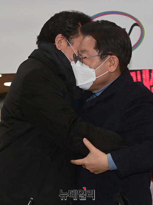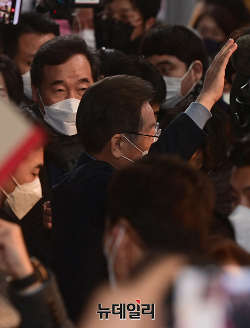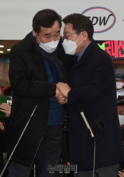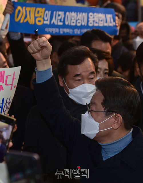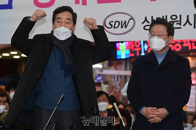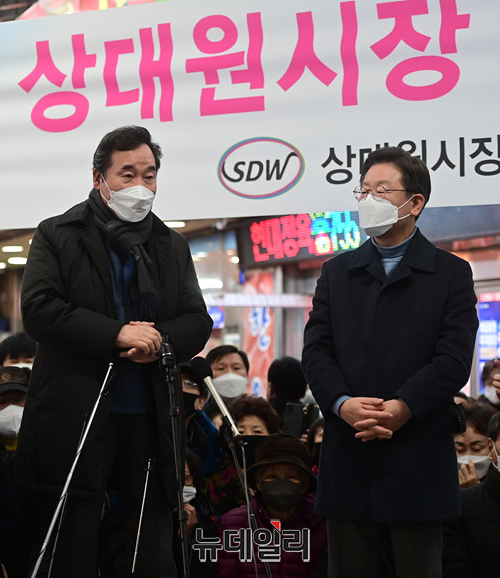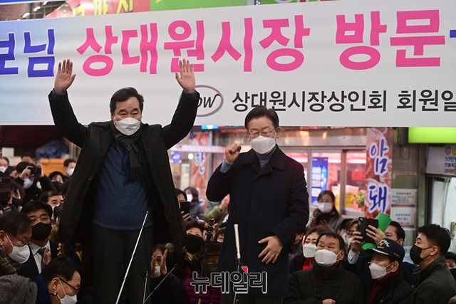 경기지역을 방문중인 이재명 더불어민주당 대선후보가 24일 오후 경기 성남시 중원구 상대원시장을 방문해 이낙연 전 대표와 손을 잡고 화답하고 있다. 상대원시장은 이 후보가 거주했던 곳이다. 이 후보는 이날 지지자들 앞에서 어린시절 이야기를 하며 눈물을 보이기도 했다. (경기 성남=정상윤 기자)
