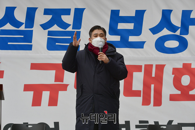 코로나피해자영업총연합(코자총)의 '분노와 저항의 299인 릴레이 삭발식'이 25일 서울 여의도 국회 인근에서 열린 가운데 최승재 국민의힘 의원이 발언을 하고 있다.