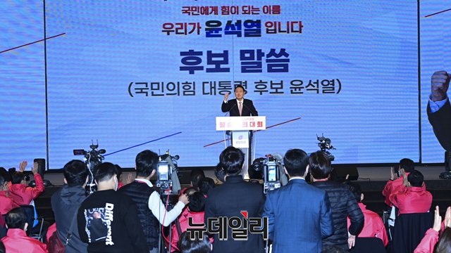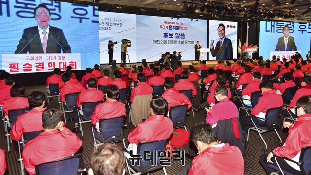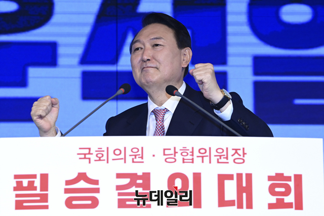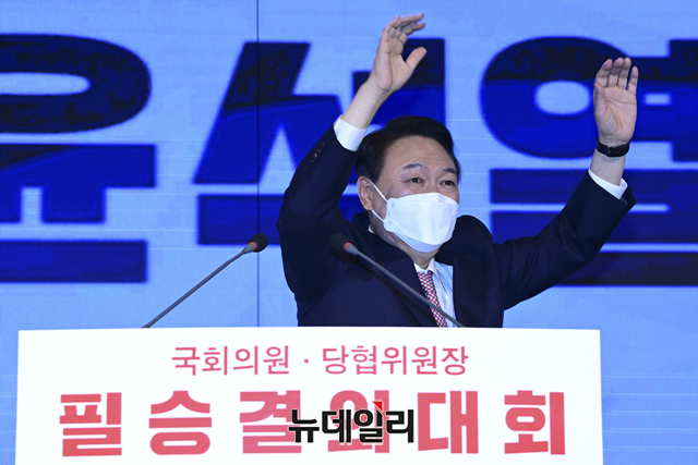 윤석열 국민의힘 대선후보가 26일 오후 서울 여의도 중소기업중앙회관 KBIZ홀에서 열린 '우리가 윤석열이다!' 국회의원 및 원외당협위원장 필승결의대회에서 주먹을 쥐고 인사를 하고 있다.