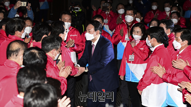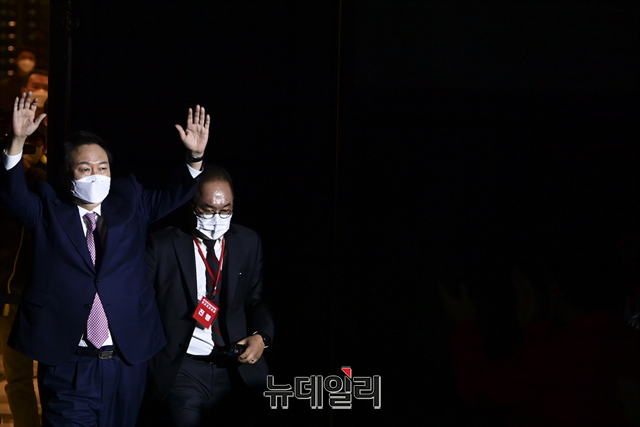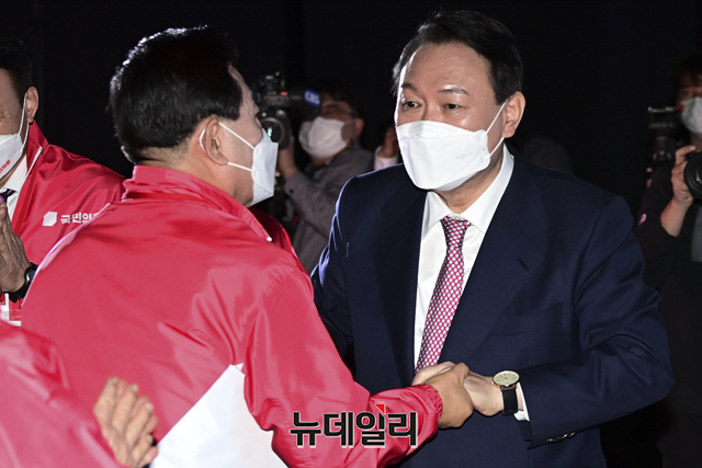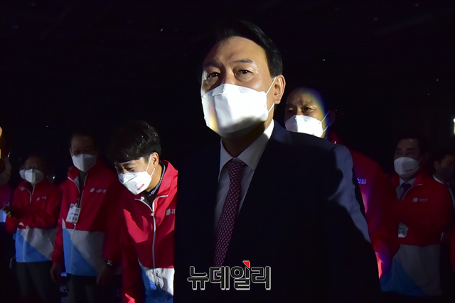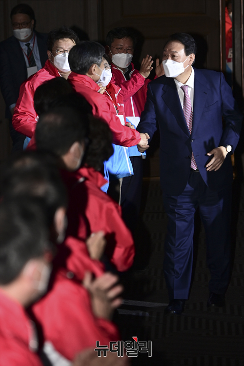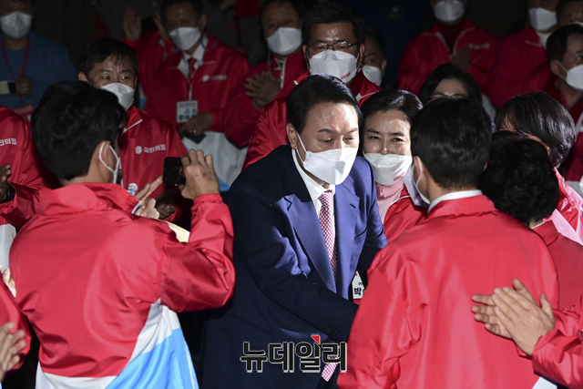 윤석열 국민의힘 대선후보가 26일 오후 서울 여의도 중소기업중앙회관 KBIZ홀에서 열린 '우리가 윤석열이다!' 국회의원 및 원외당협위원장 필승결의대회에서 당원들에게 인사를 하고 있다.