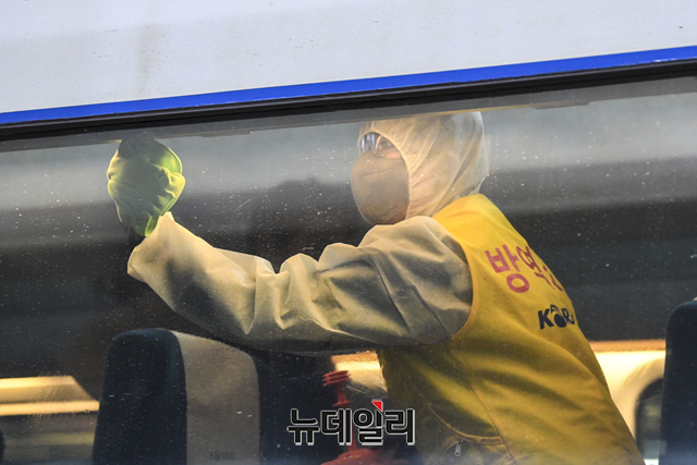 설날 명절 연휴를 앞둔 27일 오전 서울 중구 서울역 승강장에 정차된 KTX 객실 내부에서 한국철도공사(코레일) 방역 작업원이 설 대수송 대비를 위한 방역작업을 진행하고 있다.