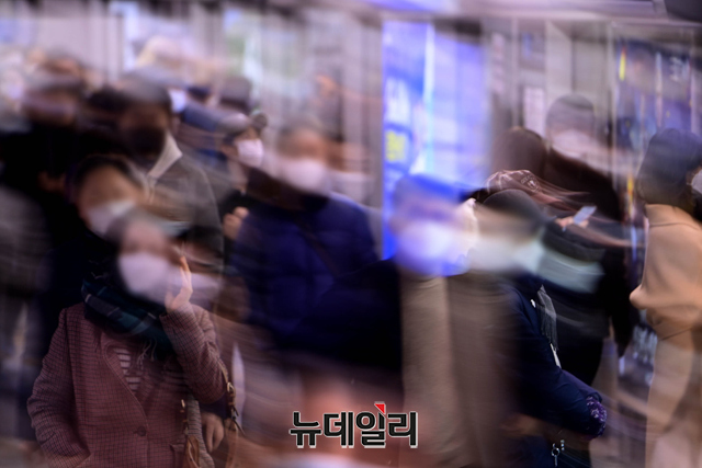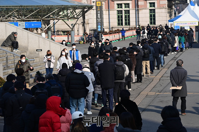 코로나19 신규확진자가 14,518명이 발생한 27일 오후 서울 중구 서울역 1호선 승강장에 안내판에 신규 확진자 정보가 나오고 있다.