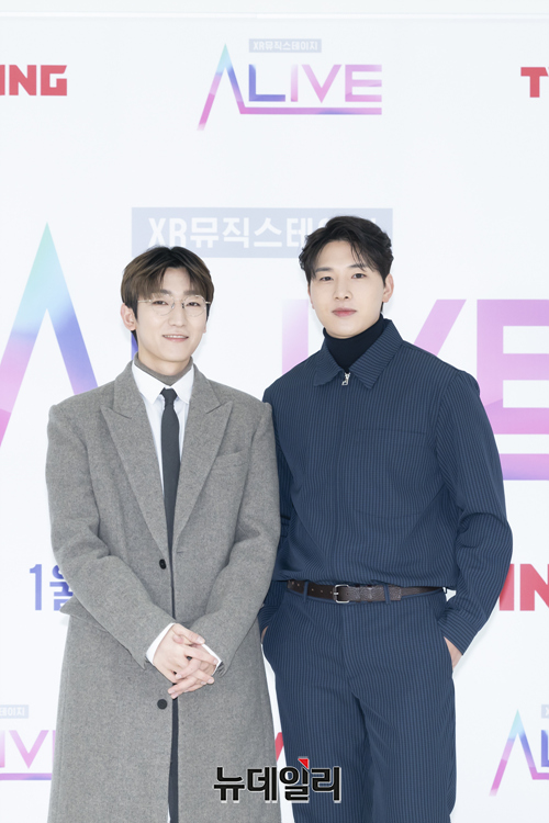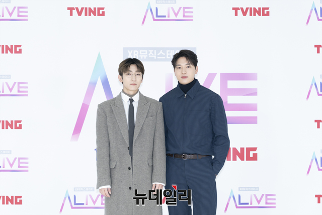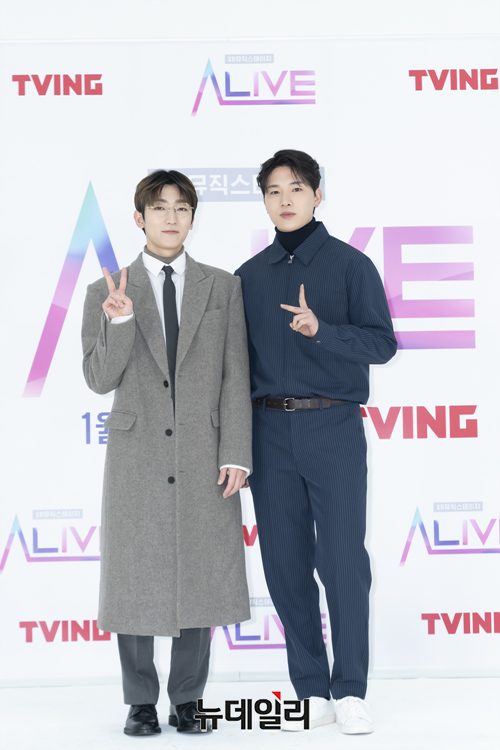 남성 듀오 멜로망스 정동환(왼쪽), 김민석이 27일 오후 온라인으로 열린 티빙 오리지널 '얼라이브(연출 이선우)' 제작발표회에서 포즈를 취하고 있다.'얼라이브'는 하늘의 별이 된 영원한 스타 유재하, 임윤택을 다시 만나보는 티빙의 오리지널 콘텐츠로 두 스타와 함께한 동료들의 이야기와 동료들의 버스킹 공연과 인공지능 기술을 활용한 고인의 무대까지 선보인다.이어 임윤택의 유작과 35년 만에 공개되는 유재하의 신곡 공개를 예고했다. 28일 공개. (사진=티빙)