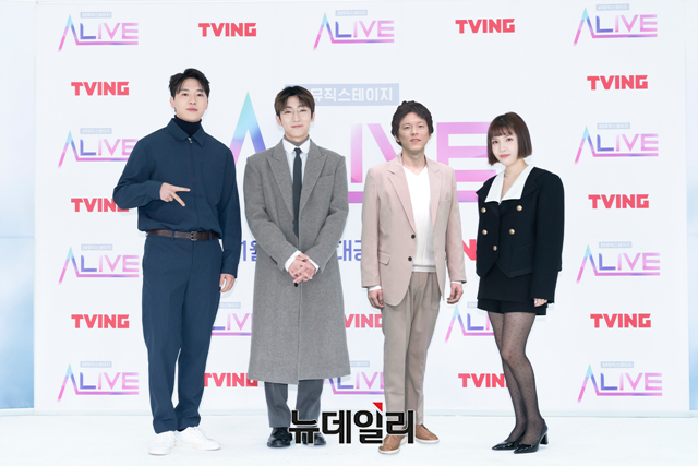 멜로망스 멤버 김민석, 정동환, 가수 김나영, 연출 이선우, 그룹 울랄라세션 멤버 최도원, 김명훈, 박승일, 배우 김정은(왼쪽부터)이 27일 오후 온라인으로 열린 티빙 오리지널 '얼라이브' 제작발표회에서 포즈를 취하고 있다.'얼라이브'는 하늘의 별이 된 영원한 스타 유재하와 임윤택을 다시 만나보는 프로그램이다. 두 스타와 함께한 동료들의 이야기와 동료들의 버스킹 공연 그리고 AI(인공지능) 기술을 활용해 고인의 무대를 선보인다.28일 티빙에서 첫 공개. (사진=티빙)