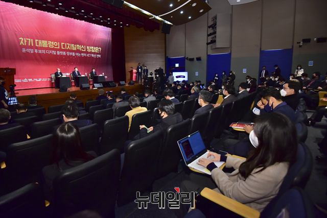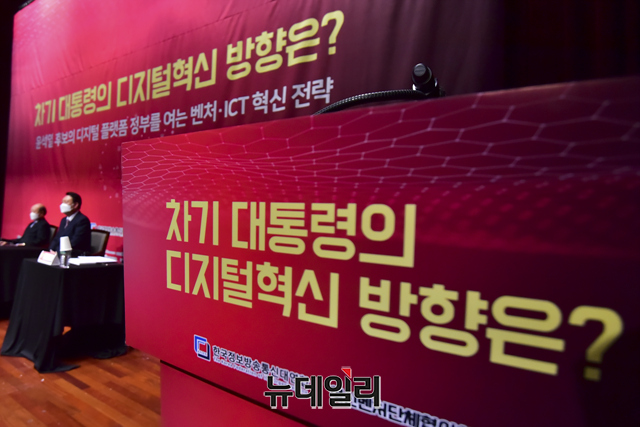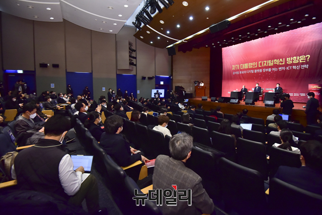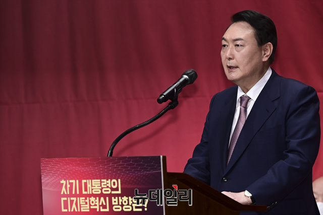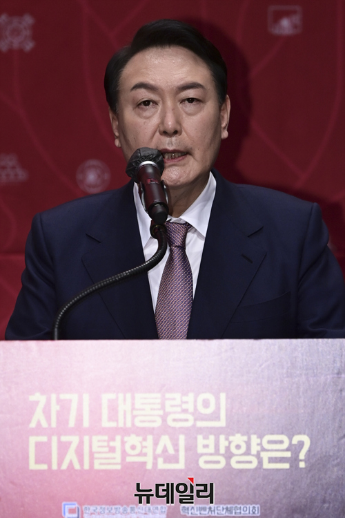윤석열 국민의힘 대선후보가 28일 오후 서울 마포구 누리꿈스퀘어에서 '차기 대통령의 디지털혁신 방향은?' 주제로 진행된 벤처 ICT 혁신 전략 토론회에서 발언을 하고 있다.