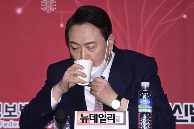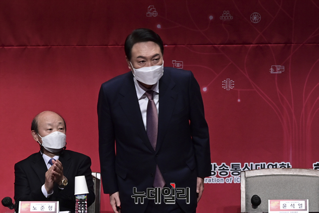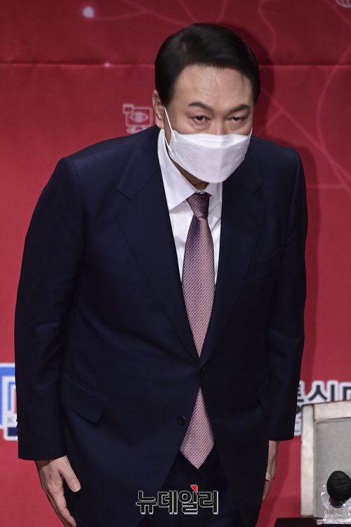 윤석열 국민의힘 대선후보가 28일 오후 서울 마포구 누리꿈스퀘어에서 '차기 대통령의 디지털혁신 방향은?' 주제로 진행된 벤처 ICT 혁신 전략 토론회에서 인사를 하고 있다.
