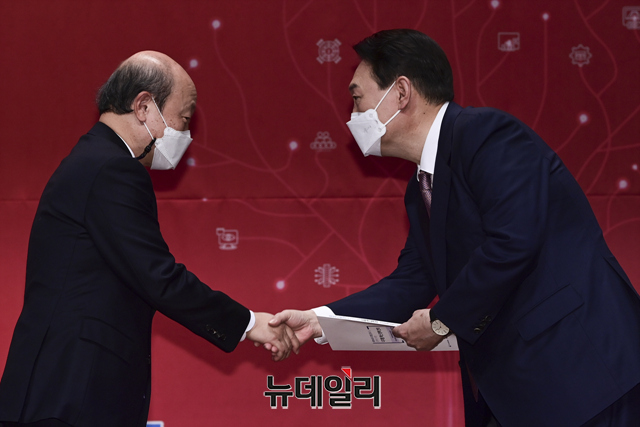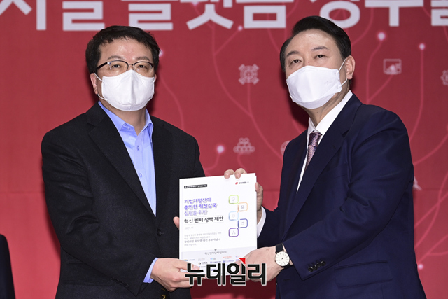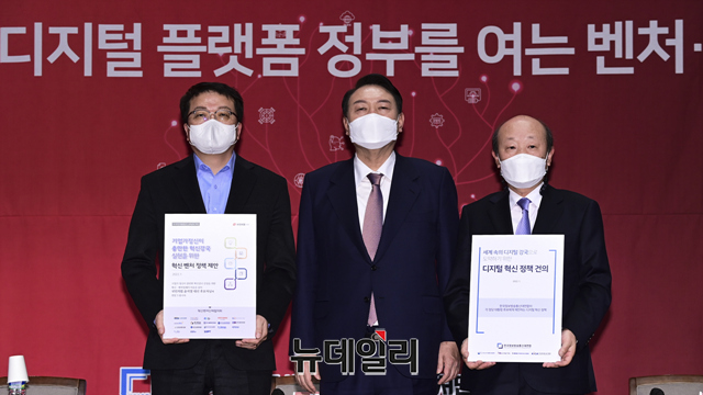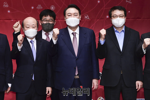 윤석열 국민의힘 대선후보가 28일 오후 서울 마포구 누리꿈스퀘어에서 '차기 대통령의 디지털혁신 방향은?' 주제로 진행된 벤처 ICT 혁신 전략 토론회에서 참석자들과 기념촬영을 갖고 있다.