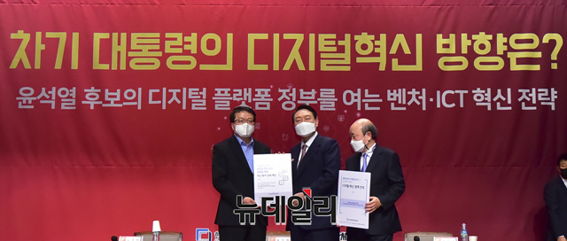 토론회에는 윤 후보, 노준형 ICT대연합 회장, 강삼권 혁신벤처단체협의회장, 박재문 ICT대연합 사무총장, 이정민 혁신벤처단체협의회 사무국장 등이 참석했다.