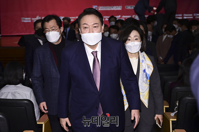 윤석열 국민의힘 대선후보가 28일 오후 서울 마포구 누리꿈스퀘어에서 '차기 대통령의 디지털혁신 방향은?' 주제로 진행된 벤처 ICT 혁신 전략 토론회를 마치고 이동하고 있다.