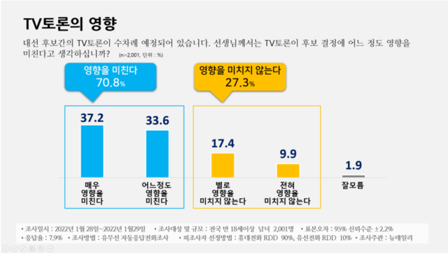 공식적으로 대선 유세 현장에 모습을 드러내지 않고 있는 김건희씨와 관련해서는 공개행보가 필요하다는 의견이 58%로, 공개행보를 할 필요가 없다는 의견(31%)보다 높았다. '적극적인 공개행보가 필요하다'는 응답은 25.8%, '필요할 때 나서는 정도의 행보는 필요하다'는 응답이 32.2%였다. 잘 모름은 11%였다.'후보 결정에 TV토론 영향 미친다' 70.8%여야가 윤석열 후보와 이재명 후보의 양자 TV토론을 두고 신경전을 벌이고 있는 가운데 TV토론이 유권자의 선택에 큰 영향을 미친다는 여론조사도 나왔다. 민주당과 국민의힘은 오는 31일 오후 6시~8시까지 양자 토론을 하기로 합의했지만 토론 방식과 관련해 거리를 좁히지 못하고 있다. 민주당은 민생경제·외교안보·도덕성 검증 등을 주제로 하는 토론을 강조하고 있고, 국민의힘은 자유 토론을 주장하는 상황이다.이를 두고 'TV토론이 후보 결정에 어느 정도 영향을 미친다고 생각하느냐'는 질문에 영향을 미친다는 응답이 70.8%를 차지하며 압도적으로 높았다. 영향을 미치지 않는다는 의견은 27.3%에 불과했다.구체적으로 '매우 영향을 미친다'는 응답이 37.2%, '어느 정도 영향을 미친다'는 비율은 33.6%였다. 반면 '별로 영향을 미치지 않는다' 17.4%, '전혀 영향을 미치지 않는다'는 9.9%였다.이번 조사는 뉴데일리 의뢰로 PNR리서치가 지난 28~29일 이틀 동안 전국 만 18세 이상 남녀 2001명을 대상으로 유무선 자동응답 전화조사 방식으로 진행됐다. 휴대전화 RDD 90%, 유선전화 RDD 10% 비율로 피조사자를 선정했으며 최종 응답률은 7.9%, 표본오차는 95% 신뢰수준에서 ±2.2%p다. 자세한 내용은 중앙선거여론조사심의위원회 홈페이지를 참고하면 된다.